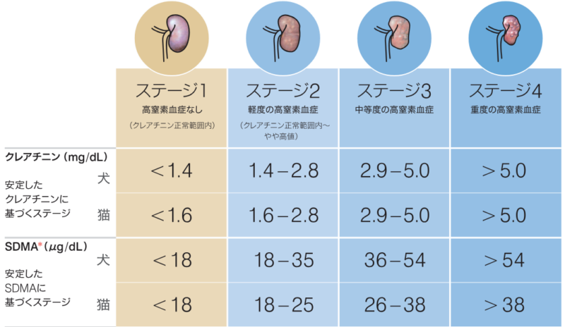 このステージ分類は画像診断や尿検査等に加えて、クレアチニン(Cre)、SDMAという血液検査の数値を参考に決まります。