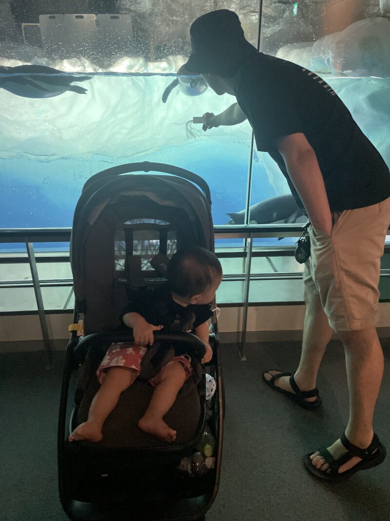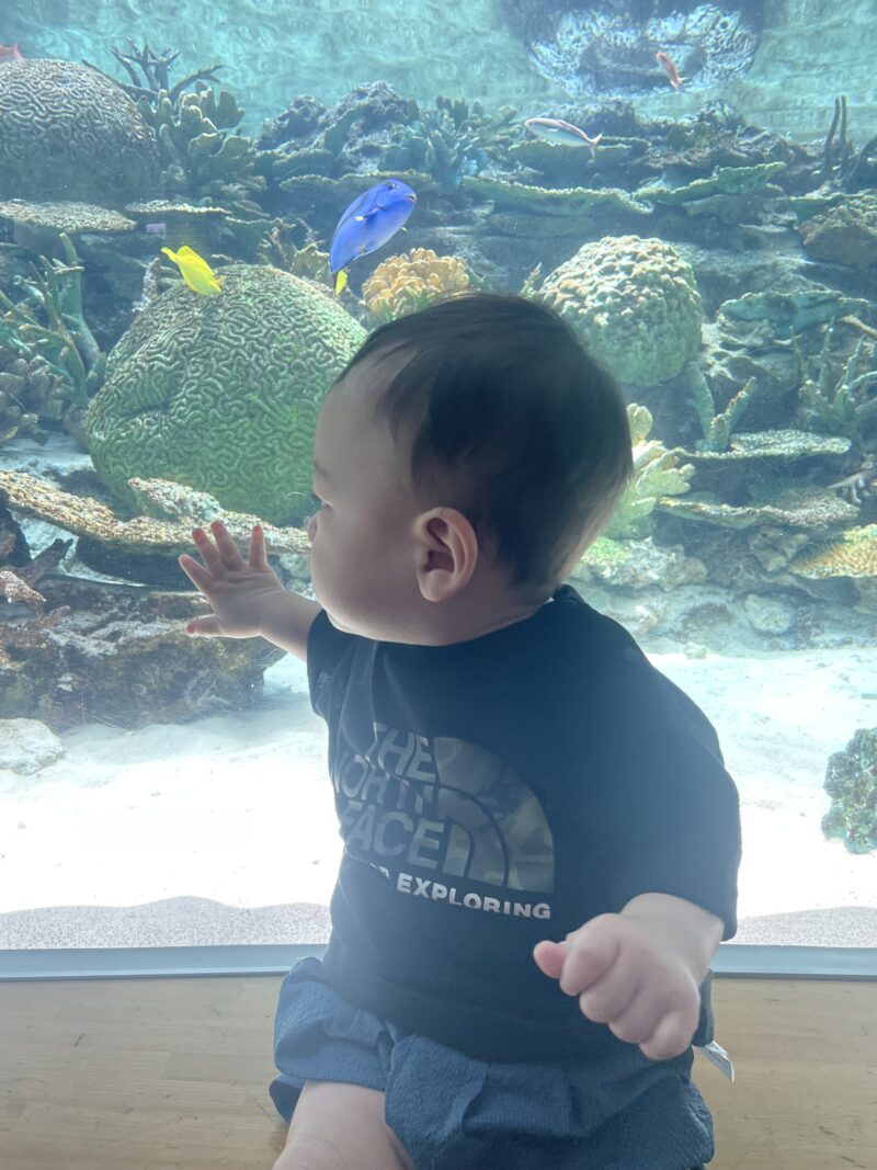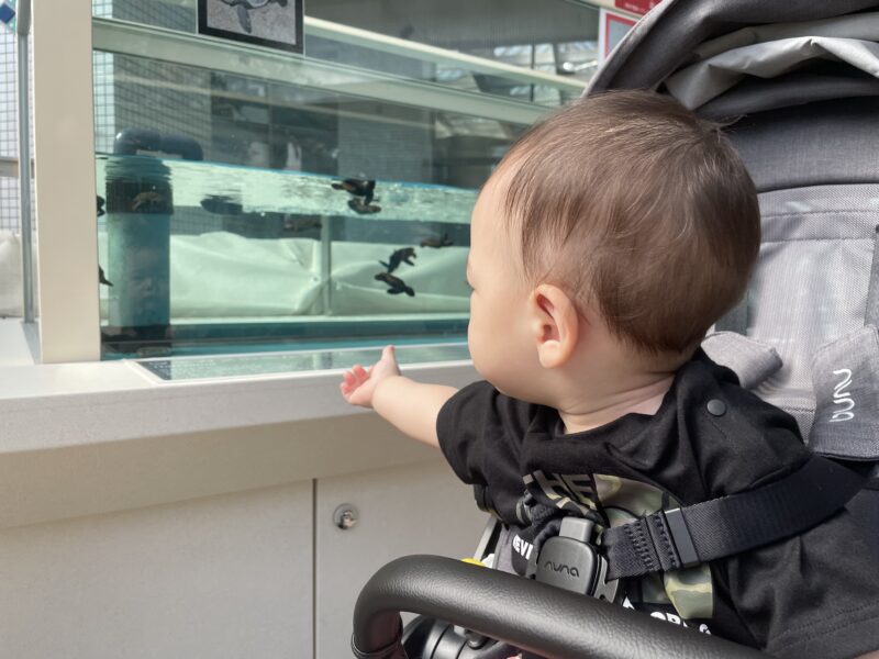 水族館をぐるっと一周する間、寝ることもぐずることもなくキョロキョロと興味ありそうに見ていてくれました。