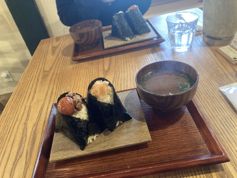 おにぎりは具をカスタムできて私は卵黄醤油漬けと肉そぼろのおにぎりと明太子おにぎり、お味噌汁をチョイスしました。