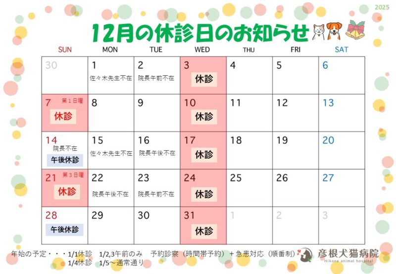 12月下旬以降はフードやお薬の納品が年明けになることがありますので、お早めにご注文ください。