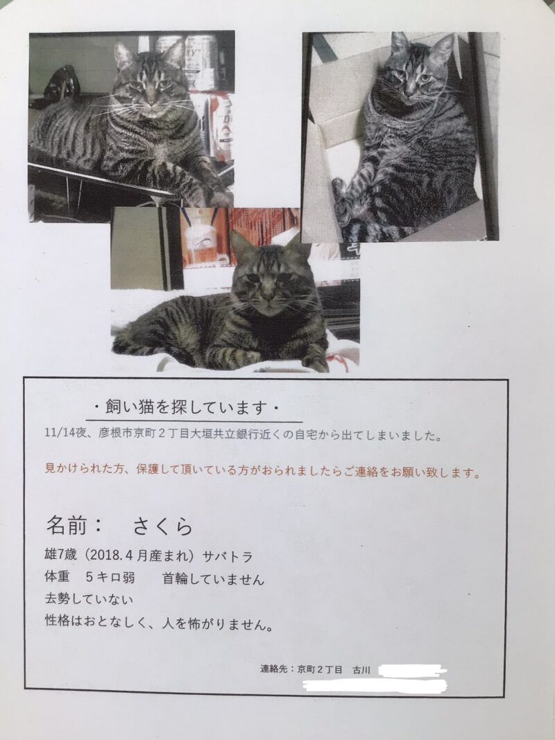 迷子猫さん情報呼びかけ(彦根市京町)