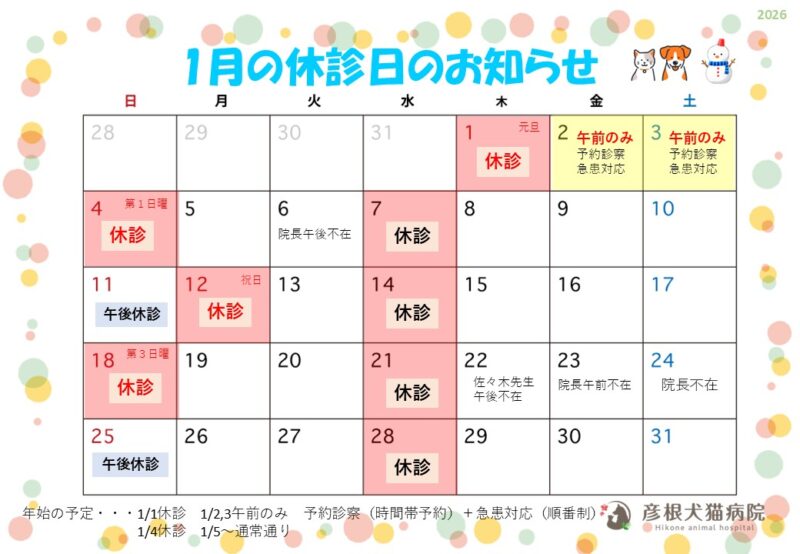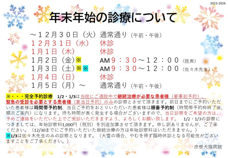 (年末年始の診察について詳細はこちら→「年末年始の診察について」をごらんください。)
